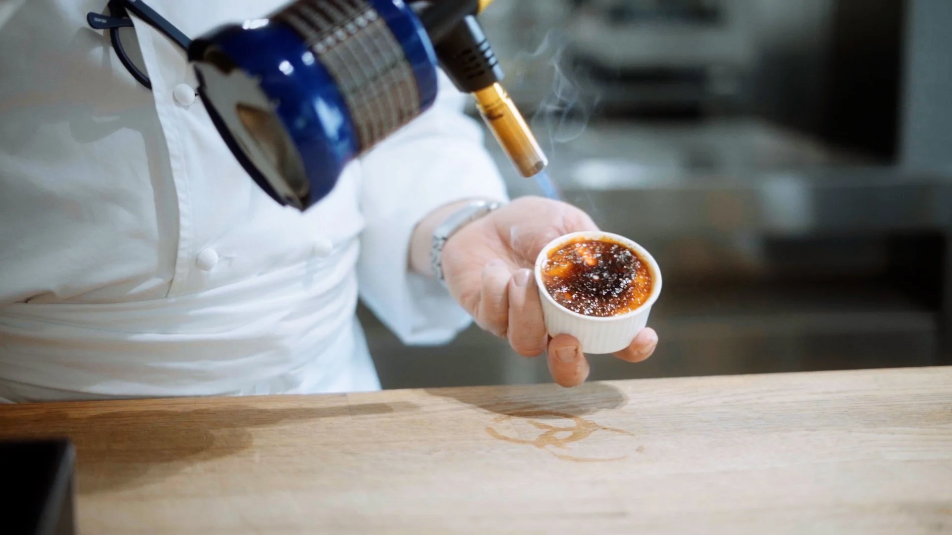 A chef sprinkles caramelized sugar on a crème brûlée with a torch in a kitchen.